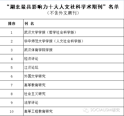 湖北最具影响力十大人文社科学术期刊”名单如下: